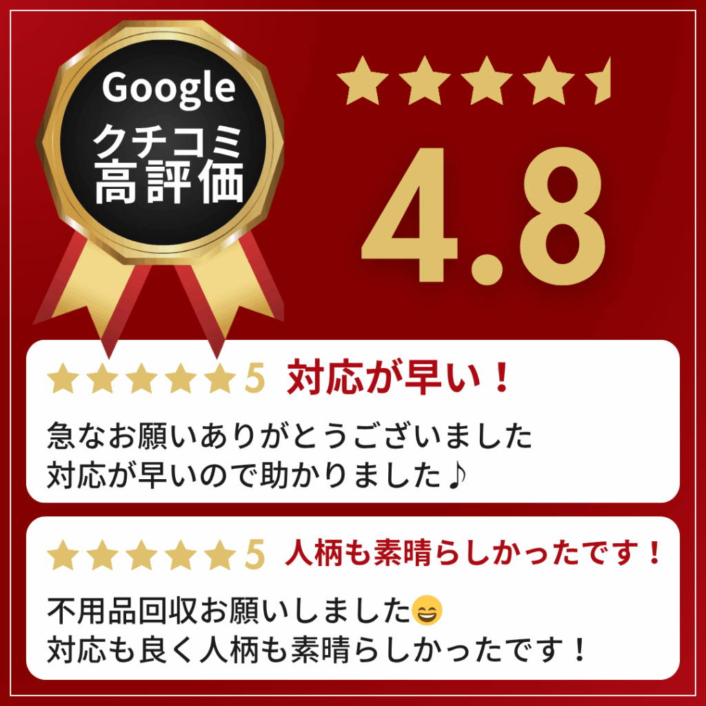 回収費用を抑えるチャンスです。当社は回収と同時に、再販価値のある家具や家電などを積極的に高価買取いたします。この買取金額を回収費用から差し引くことで、お客様へ費用を「還元」し、実質的なご負担を大幅に軽減することが可能です。捨てるはずだったものが、お得なメリットとなってお客様の元に戻ります。